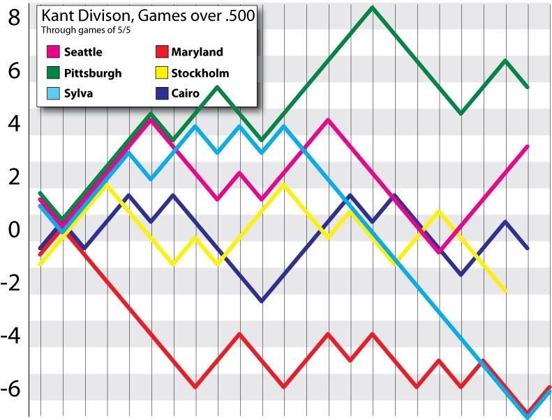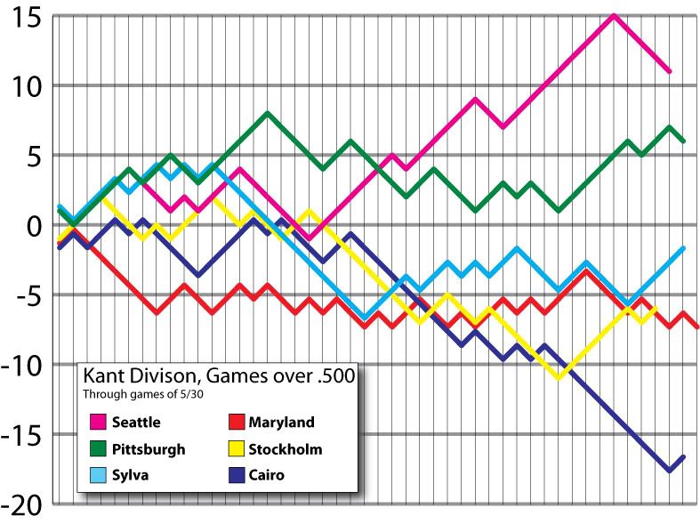 Seattle continues to pull away in the Kant division, opening a 4.5 game lead. Their wins included a 12-inning shutout of Stockholm on May 17. Pittsburgh holds on to second place with a paltry 19-18 record, as only two Kant squads are posting records above .500.